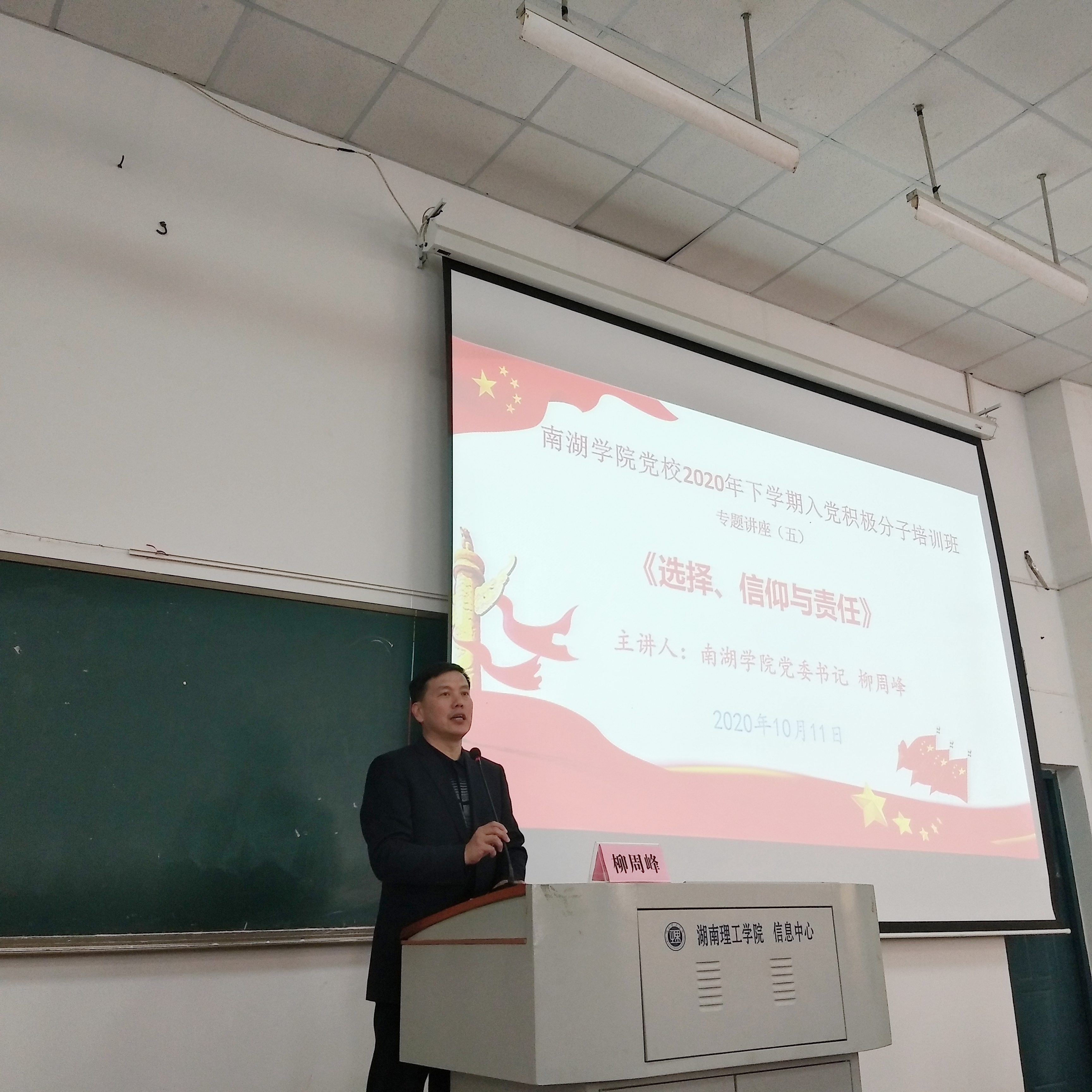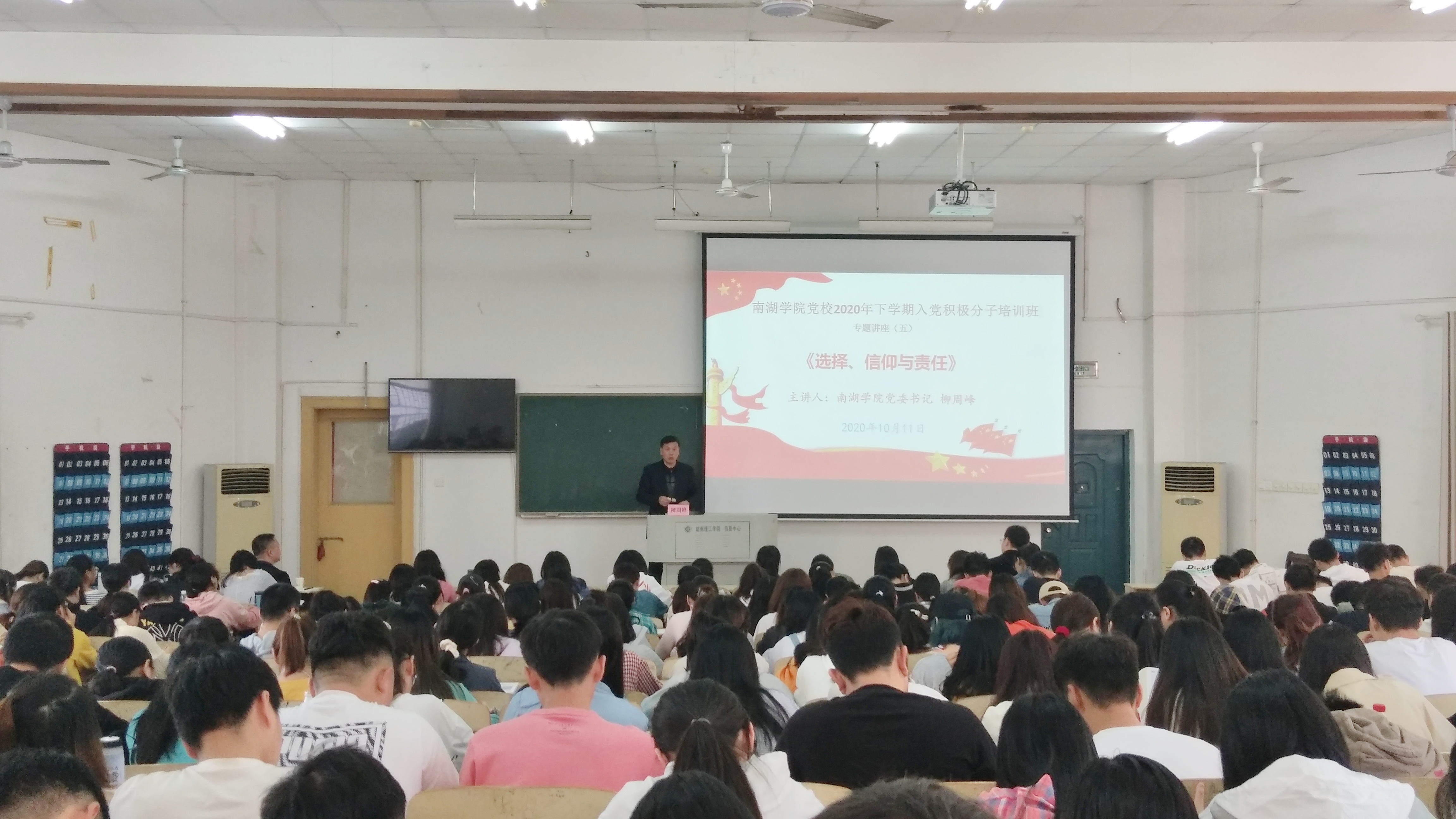 10月11日上午,南湖学院党校2020年下学期入党积极分子培训班第五讲在2号楼2T3教室举行。本次讲座由南湖学院党委书记柳周峰为全体学员授课,经管系党总支副书记李鹏主持,270名入党积极分子参加学习。