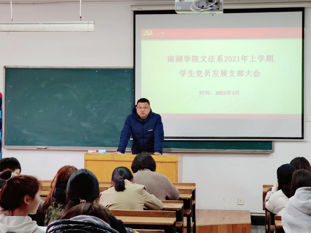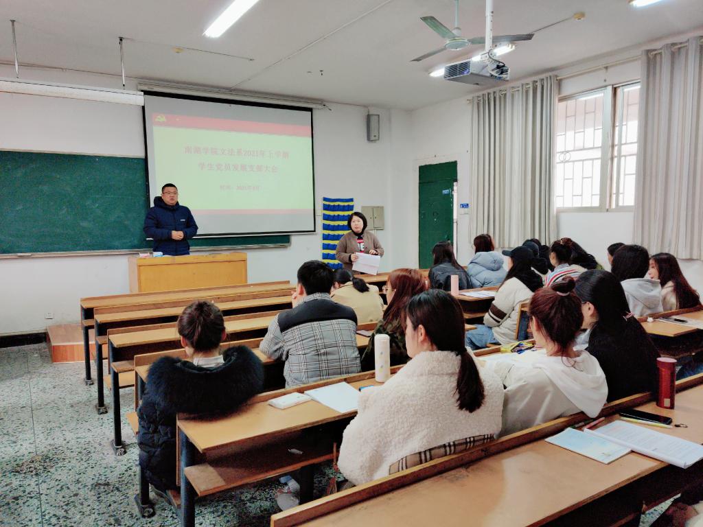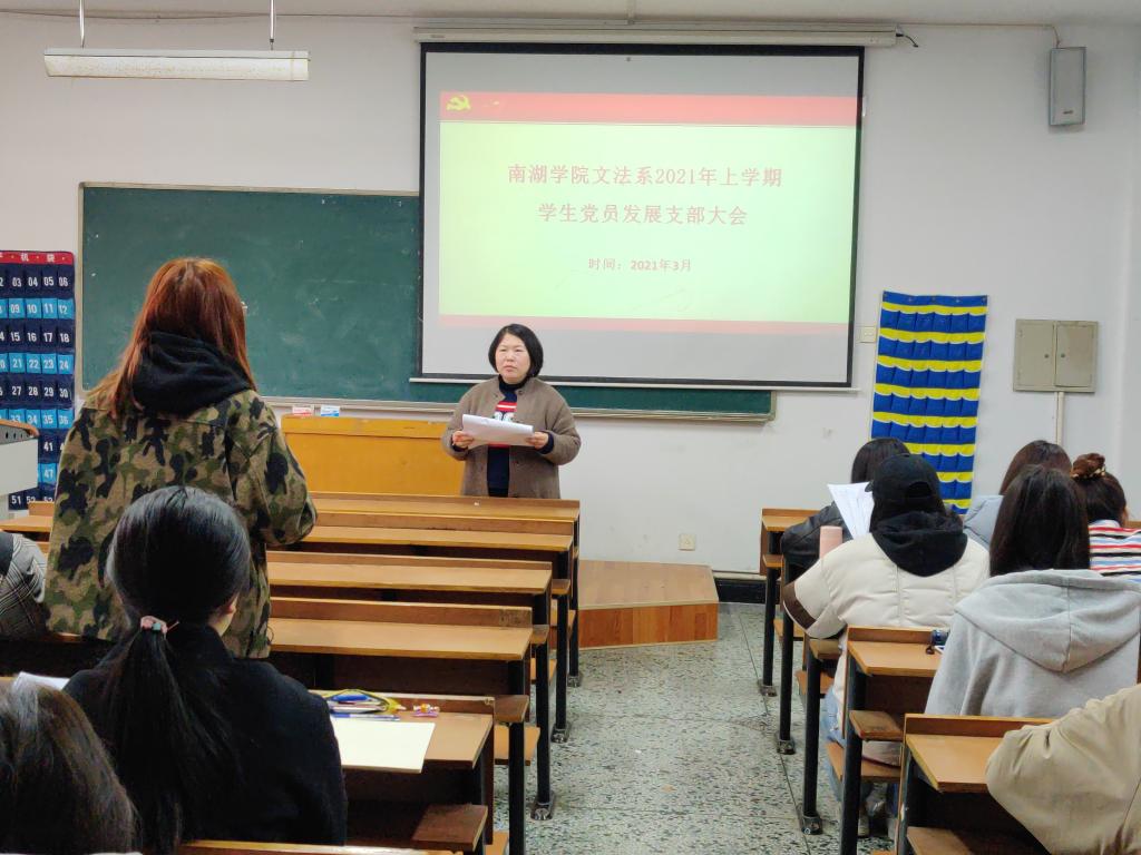 3月5日下午,文法系学生党支部在2号文学楼2311教室召开党员发展大会。按照《发展党员工作流程》的有关规定,严格按照组织程序抓好各个环节的落实工作,在党员大会上通过无记名投票表决通过了沈韫馨等11位同志为中共预备党员。文法系党总支书记付亚子、辅导员欧阳群力、黄琴以及全体在校学生党员参加,会议由学生党支部书记贺青老师主持。