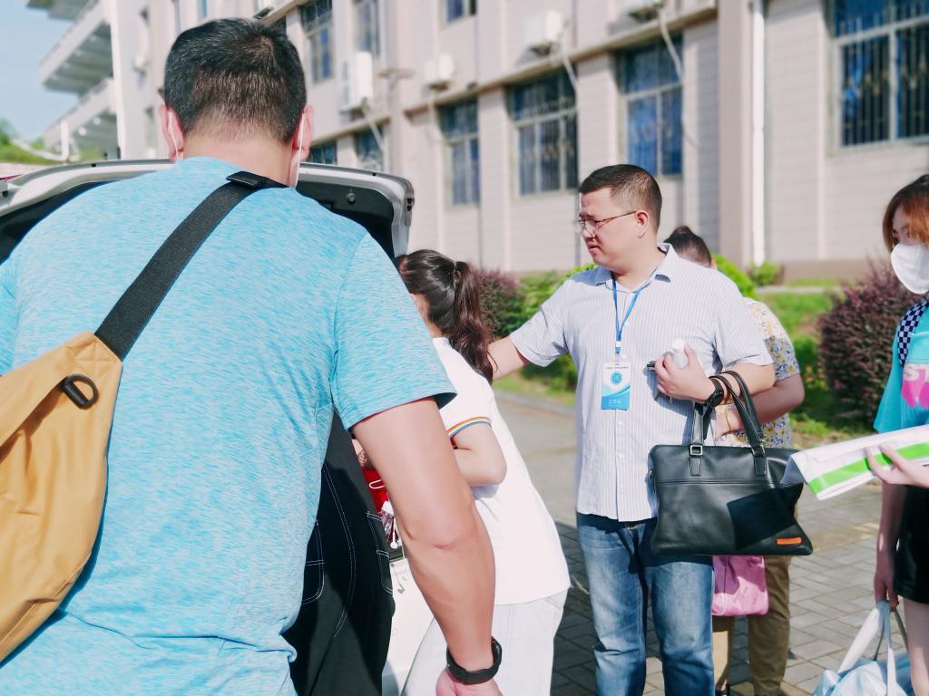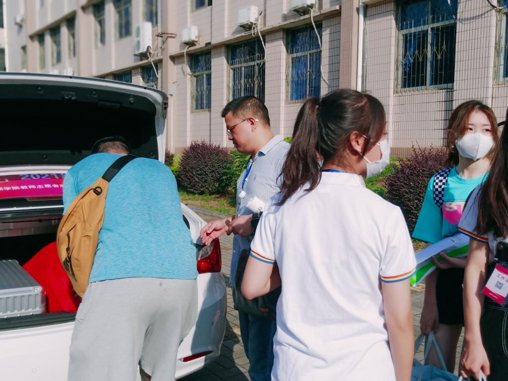 “我马上到!”“有学生来的时候喊一声,我就在这里。”“爱心车队志愿者”群里,简单但温暖的话语透露着师者对学生们细致的关心与爱护。“哎,哎,您好。这个我稍后过来处理,现在正在接送新生呢……”新生报道的时间也是老师们最繁忙的时候,学生没到的时候他们还需要见缝插针完成手头的工作。从晨光熹微到暮色四合,老师们像在完成一场全力以赴的接力赛,从东院到南院,又从南院到东院,他们已经记不清自己到底接送了多少位学生,只记得学生达到宿舍楼时的笑颜。