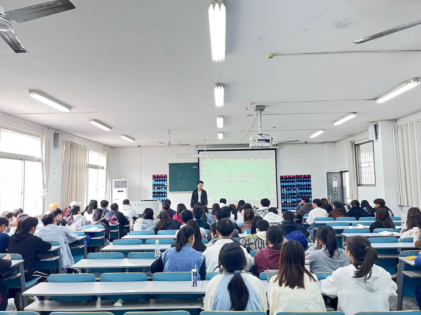 10月21日中午,文法系于二号文学楼2101教室召开第十五届团学会第四次例会,执行团副郑勇、执行主席左康出席会议,团学会全体干部参会。