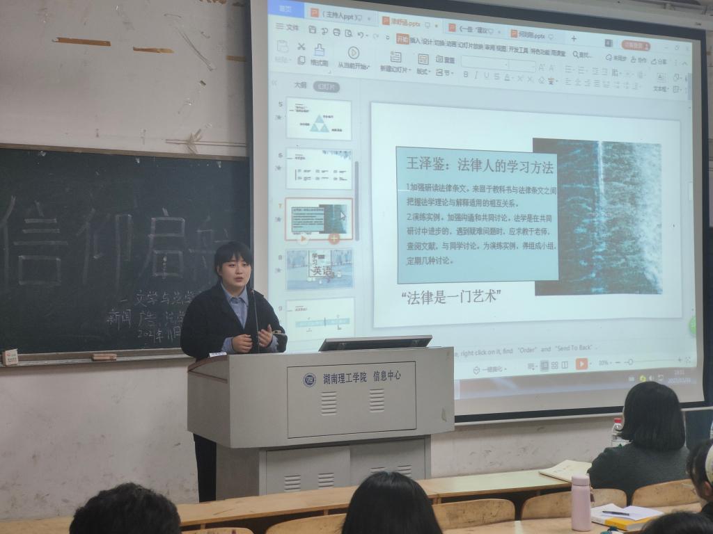 11月10日晚,文法系于二号楼2T2教室开展“我是党员听我说”新闻、广告、法学专业新生信仰启航主题教育活动。文法系党总支副书记贺青出席活动,学生代表19级法学专业漆舒涵、19级新闻专业何则刚、19级广告专业李马钊以及21级全体新闻、广告、法学专业学生参加。