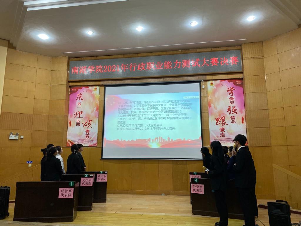 11月29日晚,南湖学院2021年行政职业能力测试大赛决赛于综合楼学术报告厅举行。本次大赛由南湖学院教务办主办,文法系承办。文法系主任赖换初、党总支书记付亚子、党总支副书记贺青、团总支书记欧阳群力出席本次大赛。全院五个系学生代表队伍参赛。