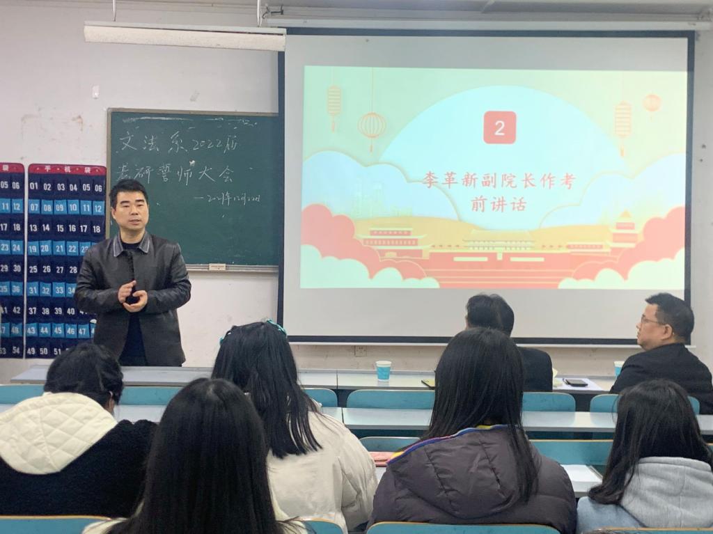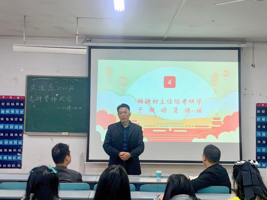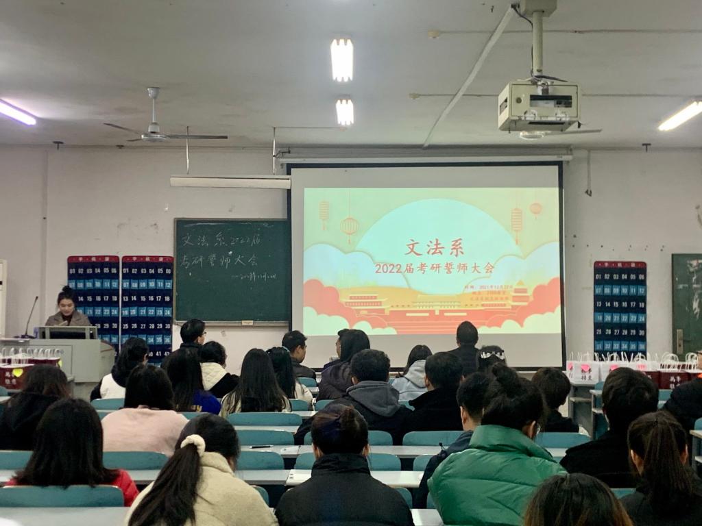 12月22日下午,文法系在2号楼2105教室举行2022届考研誓师大会。南湖学院副院长李革新、系主任赖换初、系党总支书记付亚子,18级辅导员欧阳群力与会,2022届考研学生参会。