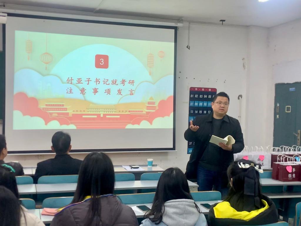 大会伊始,播放了系部老师和学弟学妹们录制的考研祝福视频,表达文法系全体师生对考研学子的美好祝愿。随后,付亚子就考研注意事项进行发言,围绕考风考纪、考前准备、考试时间把握、作息时间调整这四个方面做了具体要求,并对考研学子表达了祝愿。
