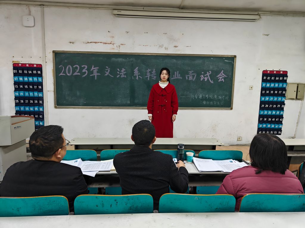 根据南湖学院学生转专业相关文件要求,文法系结合系部工作实际,2月21日下午,文法系在2号教学楼2110教室举行2023年转专业学生面试考核会,系主任尹晓闻、党总支书记付亚子、党总支副书记贺青、教学秘书及辅导员担任考核评委,38名转专业(转入)学生参加了面试考核。