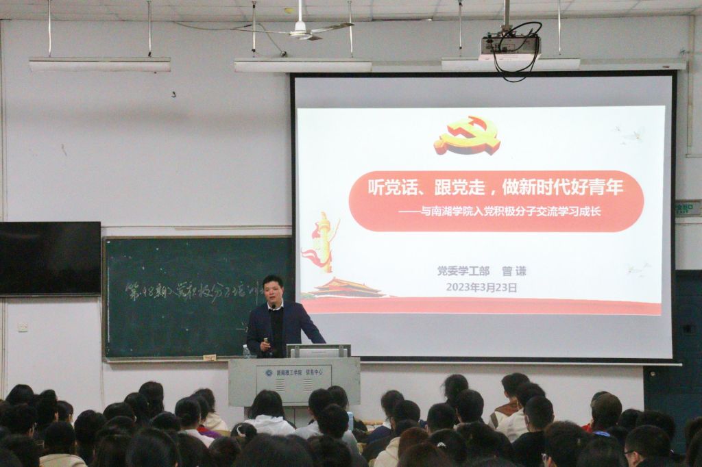3月29日晚,南湖学院2023年上学期第48期入党积极分子培训班第二讲于2号教学楼2T3教室举行。本次讲座由党委学生工作部副部长曾谦主讲,本期入党积极分子培训班共316名学员参加学习。讲座由外贸系党总支书记刘青珊主持。