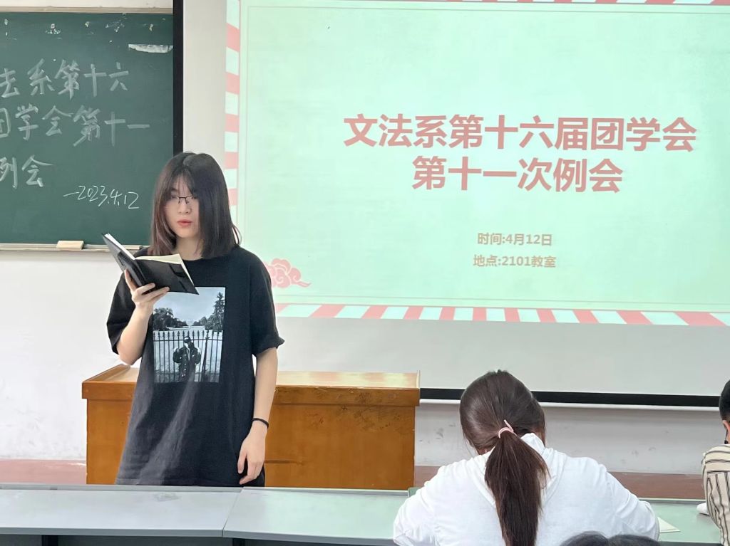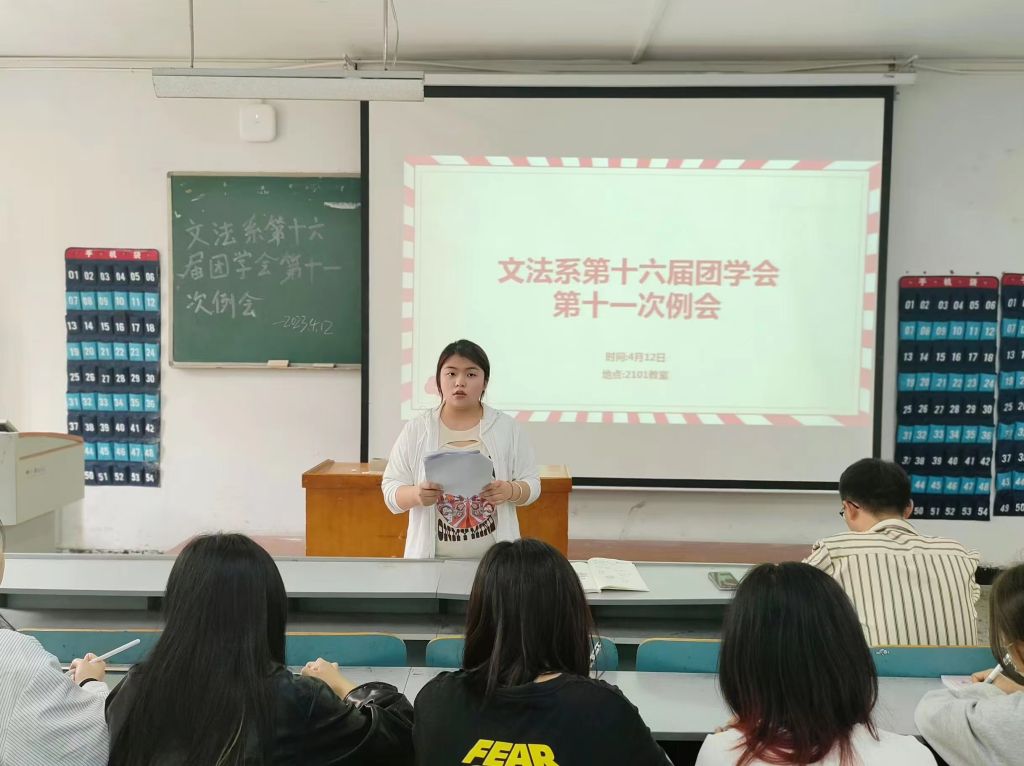 4月12日中午,我系于2号楼2101教室召开文法系第十六届团学会第十一次例会暨军训工作部署会。文法系团总支书记郭萌、执行团副程锦玉、刘思琦,执行主席李萱凤、阳乐怡与会,22级各班助班和全体团学干部参会。