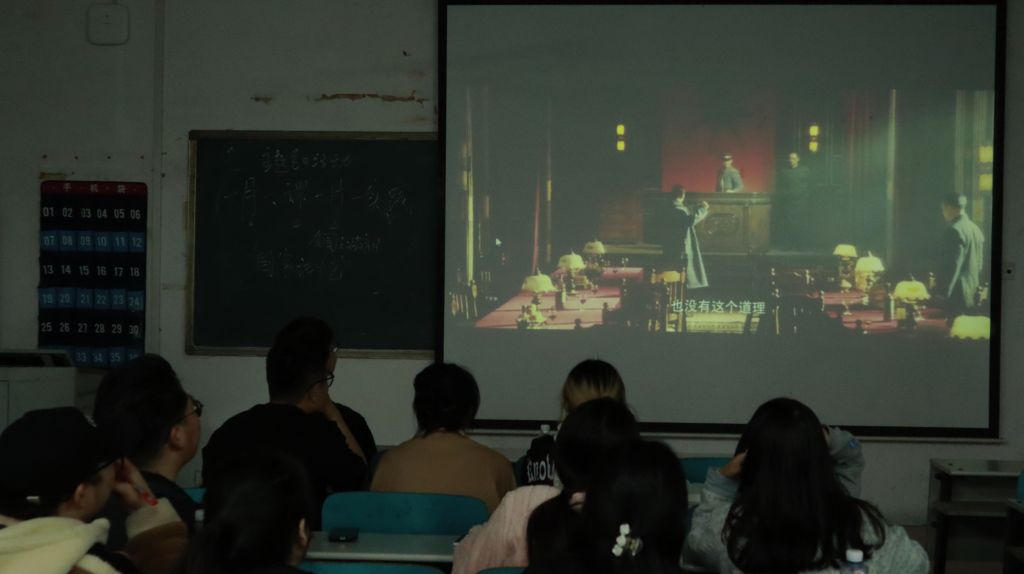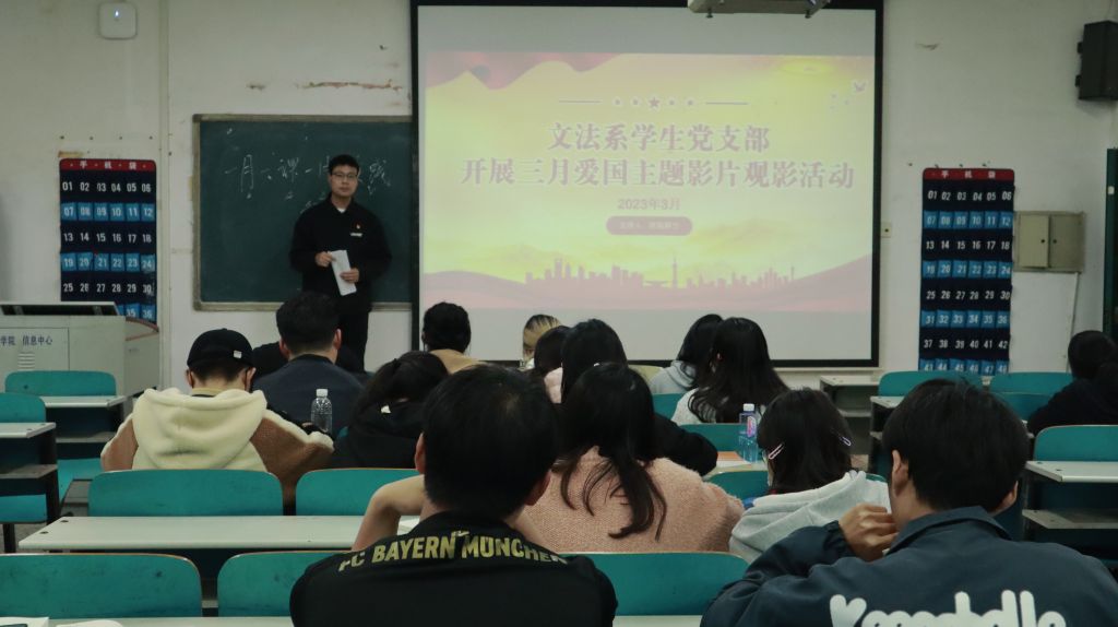 为积极学习贯彻习近平新时代中国特色社会主义思想主题教育,开展好“一月一课一片一实践”的要求,大力弘扬爱国主义精神。文法系学生党支部于3月24日在2号文学楼2101教室开展红色爱国电影《建国大业》观影活动。