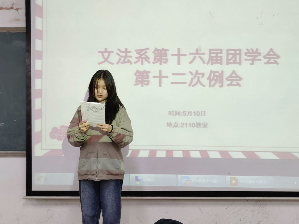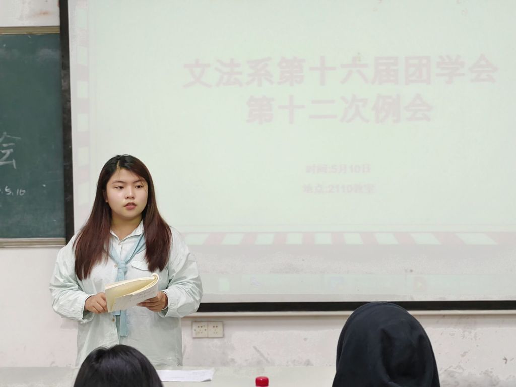 5月10日中午,文法系于2号楼2110教室召开第十六届团学会第十二次例会。文法系团总支书记郭萌,执行团副刘思琦,执行主席王婧娆、李萱凤、阳乐怡与会,全体团学干部参会。