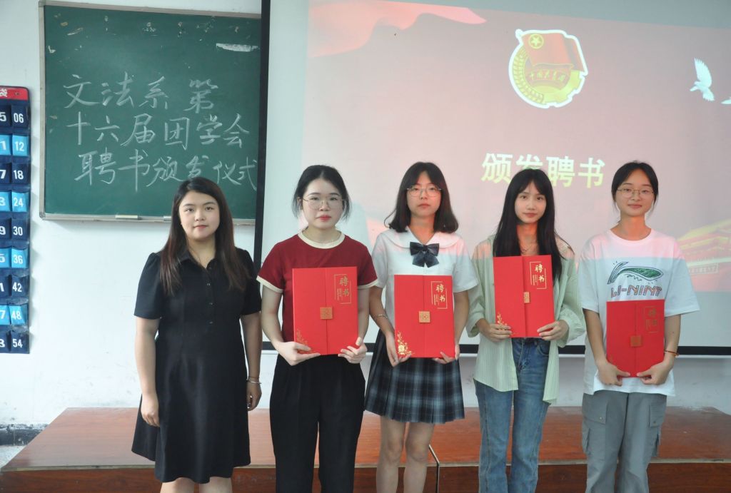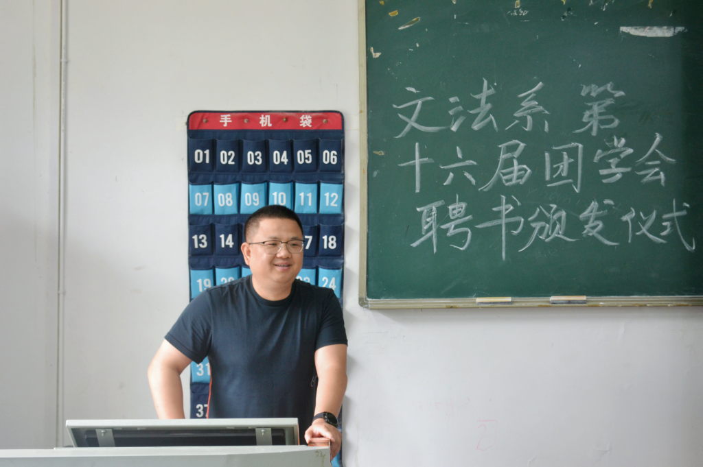 5月31日中午,文法系第十六届团学会干部聘书颁发会于2号楼2101教室召开。系党总支书记付亚子、团总支书记郭萌与会,第十六届、十七届团学会全体成员参会。